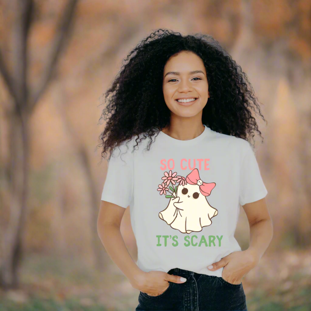 This adorable custom Halloween graphic tee features a playful "So Cute it Scary" ghost design that’s perfect for the season. Crafted from 4.2 oz., 100% Airlume combed and ringspun cotton for a soft, high-quality feel. Available in Ash (99% cotton/1% polyester) and various heathers and blends. Designed with a retail fit, side-seamed construction, and unisex sizing for comfort and style. Built to last with shoulder taping for added structure and pre-shrunk fabric to minimize shrinkage. Stand out this Halloween with a tee that’s both charming and durable